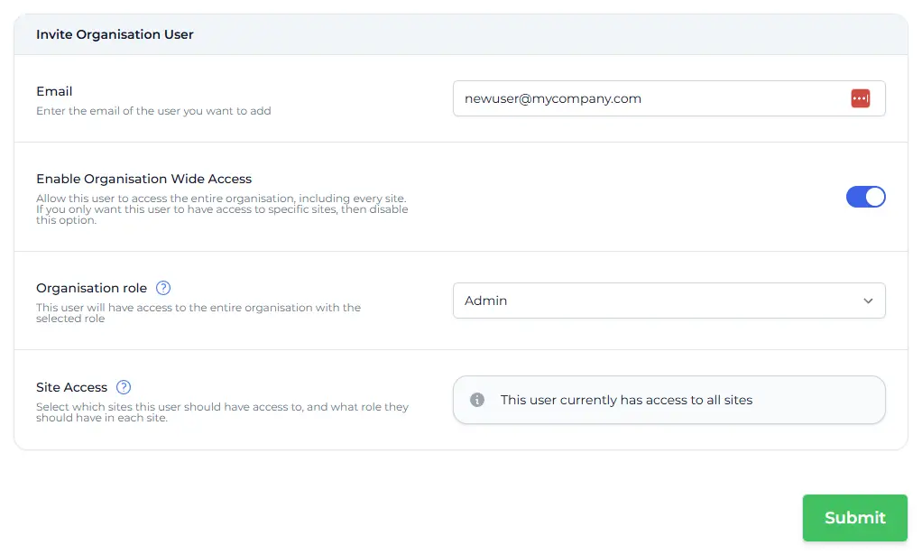 - Users can have access to a whole organisation or be limited to particular sites.